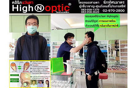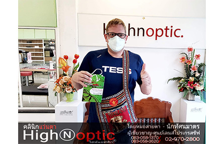 คุณเคนเนท มาเที่ยงเมืองไทย 2 เดือน พอมาถึงเมืองไทยพักผ่อนแค่วันเดียว แวะมาที่ร้านกับภรรยา ระบุต้องการ Optometrist ตรวจวัดสายตาให้เพราะ แกสายตาสั้นบวกเอียงเกิน -7.0 ที่สำคัญ สองข้างสั้นไม่เท่ากันห่างเกือบ -2.0 เห็นรูปถ่ายตอนมารับแว่น รู้สึกดีใจที่ลูกค้าชอบ และชมว่าใส่สบายตา